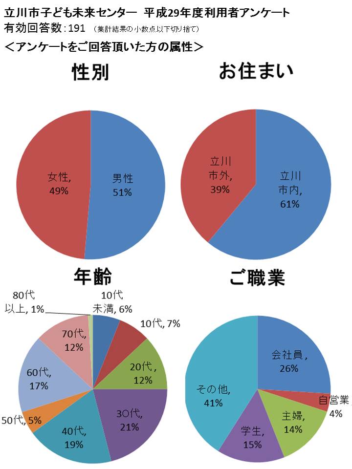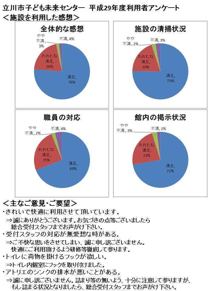 平成29年度利用者アンケート集計結果 ホーム>お知らせ>平成29年度利用者アンケート集計結果 お知らせ いつも当施設をご利用頂き誠にありがとうございます。 ご利用者の皆様からご回答頂いた、 「平成29年度利用者アンケート」の集計結果を公表させて頂きます。 多くのご意見を頂き、誠にありがとうございました。 より一層、利用しやすく快適な施設を目指して参りますので、 今後とも利用者の皆様の声をお聞かせいただければ幸いです。
