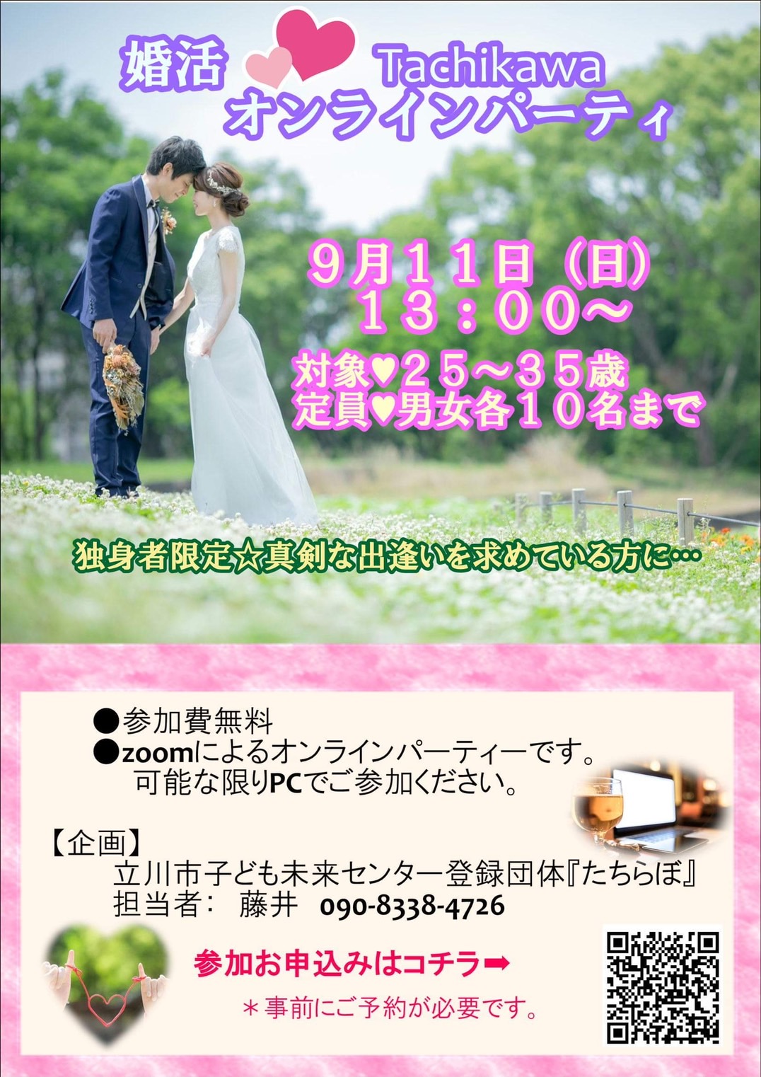 ホーム>イベント情報>【延期になりました】独身限定オンライン婚活パーティ(by たちらぼ)